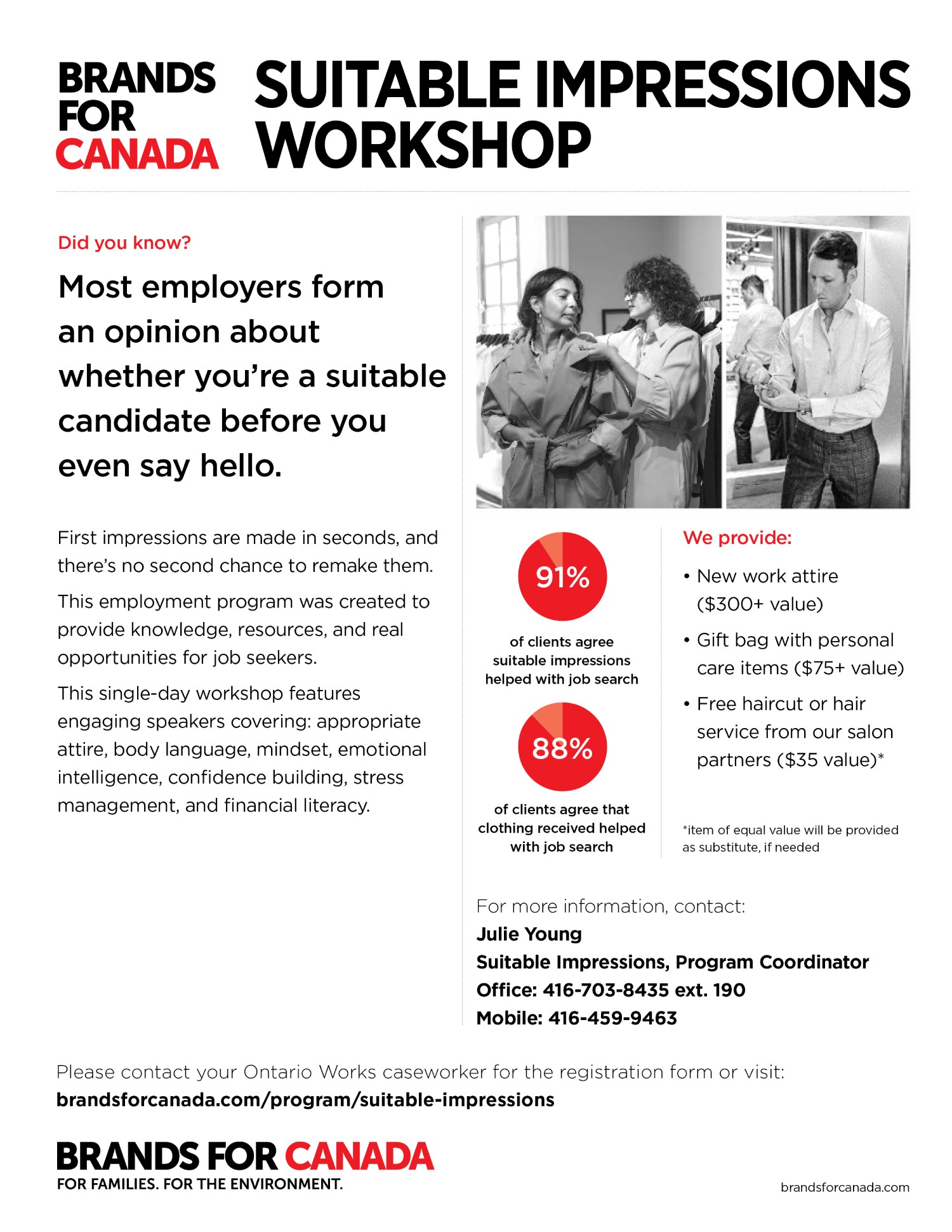 - Our Suitable Impressions facilitators are available to hold sessions at your organization’s location. Please contact Julie Ann at julie@brandsforcanada.com for further information.